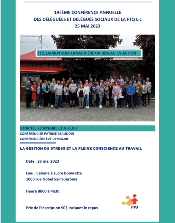 Nous avons le plaisir de vous inviter à la 19e conférence annuelle des déléguées et délégués sociaux de la FTQ Laurentides-Lanaudière qui aura pour thème Gestion du stress et la pleine conscience au travail.