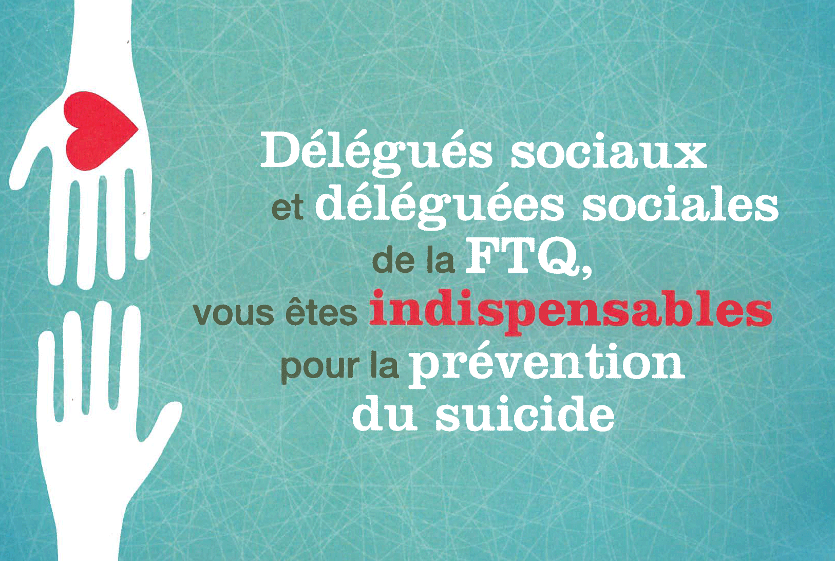 L’Association québécoise de prévention du suicide nous invite cette année à signer le Manifeste pour un Québec sans suicide. Elle propose également des outils et de l’aide par clavardage (suicide.ca) ou par téléphone (1 866 APPELLE (277-3553)). N’hésitez pas à les joindre.