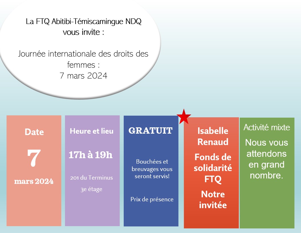 Le Conseil régional FTQ Abitibi-Témiscamingue – Nord-du-Québec vous invite à un 5 à 7 pour souligner la Journée internationale des droits des femmes. Cette activité est gratuite! Des bouchées et des breuvages seront servis.