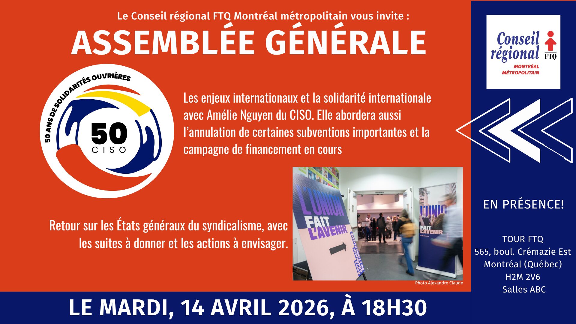 6.1. Les enjeux internationaux et la solidarité internationale avec Amélie Nguyen du CISO. Elle abordera aussi l’annulation de certaines subventions importantes et la campagne de financement en cours