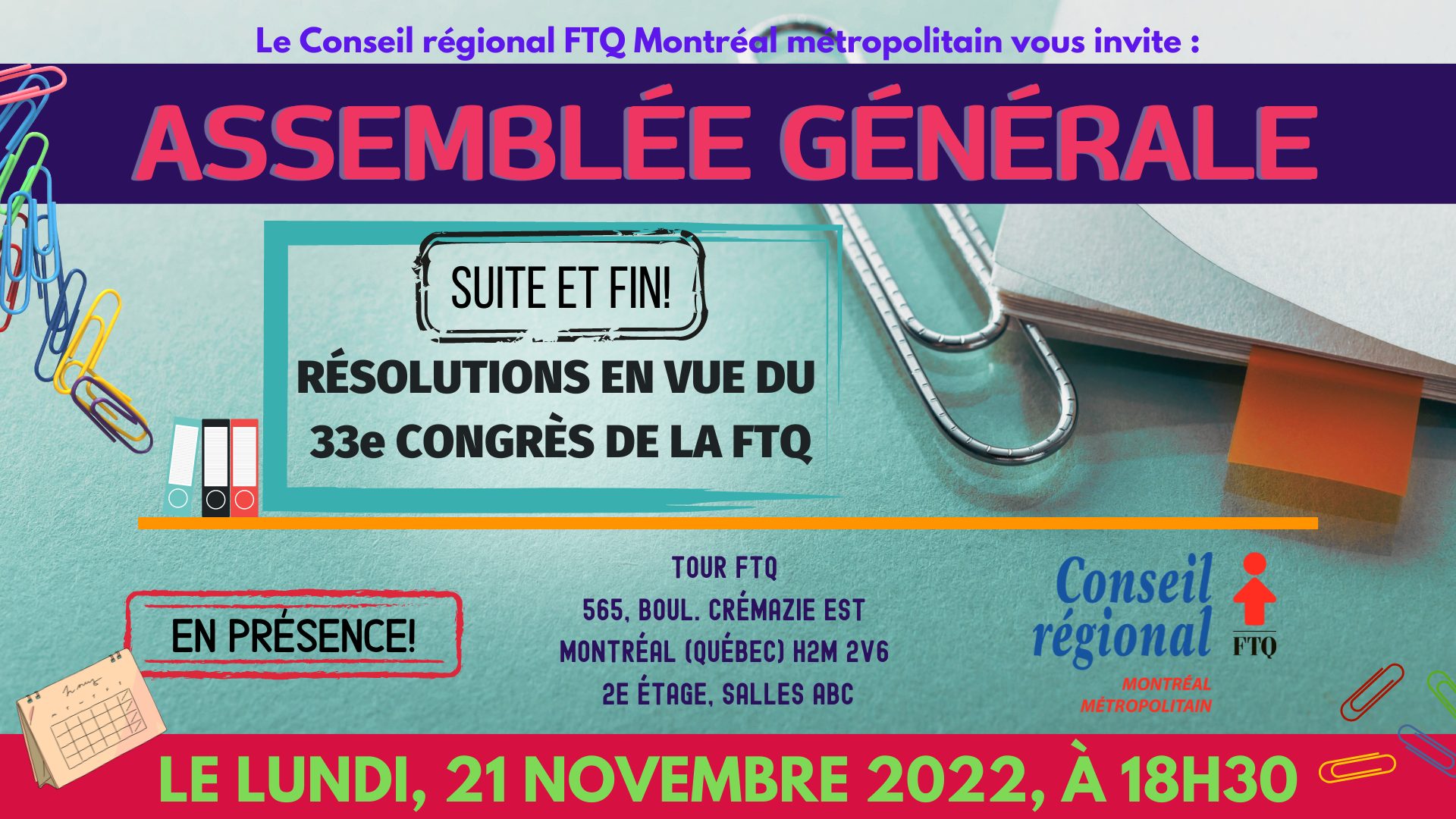 | ✅ Résolutions en vue du 33e Congrès de la FTQ – suite et fin! Nous terminerons lors de cette assemblée la lecture des résolutions en vue du 33e Congrès de la FTQ, qui aura lieu du 16 au 19 janvier 2023. L’assemblée se tiendra entièrement en présence pour en faciliter le déroulement. Veuillez confirmer votre présence à sgauthier@ftq.qc.ca. |