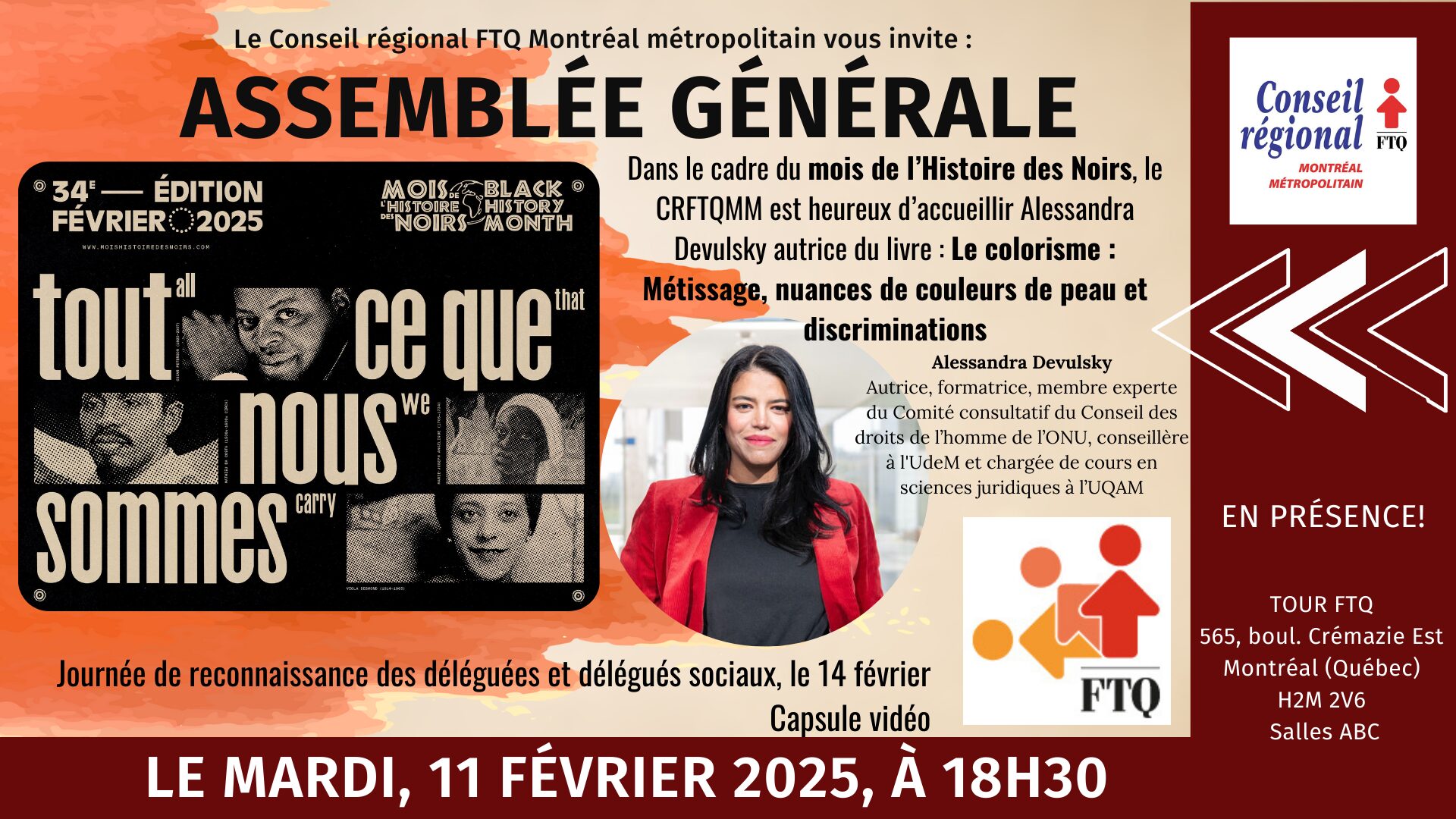 | ASSEMBLÉE GÉNÉRALE DU 11 FÉVRIER 2025 ► Dans le cadre du mois de l’Histoire des Noirs, le CRFTQMM est heureux d’accueillir Alessandra Devulsky, autrice du livre : Le colorisme. Métissage, nuances de couleur de peau et discriminations… Elle répondra aux questions suivantes: Qu’est-ce que le colorisme et en quoi celui-ci nous affecte-t-il? Alessandra Devulsky est impliquée dans différents mouvements sociaux au Brésil et au Canada, et plus particulièrement dans le domaine de la justice sociale et climatique, de l’égalité raciale et de genre. Elle est avocate au Brésil, possédant un doctorat en droit économique et financier et un master en droit politique et économique. À Montréal, elle occupe le poste de conseillère au Bureau du respect de la personne de l’Université de Montréal et enseigne en tant que chargée de cours au département des sciences juridiques de l’Université du Québec à Montréal. Elle siège également au sein des conseils d’administration de l’Institut de recherche et d’informations socioéconomiques (IRIS) et de la Maison Internationale de la Rive-Sud (MIRS). Au Brésil, elle est aussi cofondatrice et directrice juridique de l’Institut Luis Gama, un organisme qui a pour mission d’offrir de l’aide juridique gratuite aux personnes victimes de discriminations raciales au sein de leur travail. Elle est également autrice de plusieurs articles et livres, dont son plus récent « Colorismo », paru en 2021 au Brésil, ainsi que « Colorisme » qui fut lancé en France en 2023. En 2024, elle a été élue pour un mandat de trois ans aux Nations Unies, à titre d’experte au sein du Comité consultatif du Conseil de droits de l’homme. ► Capsule pour la journée de reconnaissance des personnes déléguées sociales du 14 février 2025. ► Mobilisations à venir : 19 février: Mobilisation des Métallos autour de l’enjeu de la sécurité des signaleurs routiers au bureau de la ministre des Transports, Geneviève Guilbault Depuis 2008, 22 signaleurs routiers ont perdu la vie, dont 3 en 2024 seulement. Malgré cette tragédie continue, la ministre des Transports Geneviève Guilbault et le gouvernement refusent de s’engager à mettre en place des mesures concrètes pour protéger les signaleurs et signaleuses. Quand : 19 février 2025, de 11 h à 13 h Où : 810, route Jean-Gauvin, Bureau 202, Québec (QC) G1X 0B6 Parce que chaque vie compte. 19 février: Rencontre des membres de l’Alliance TRANSIT à 16h à Montréal, à la Maison du développement durable 20 février : Conférence sur les enjeux éthiques en santé et bien-être des femmes. La question des tabous liés à la santé des femmes sera abordée en profondeur par Me Lydya Assayag, Présidente du Réseau québécois d’action pour la santé des femmes (en français). ZOOM – Lien pour s’inscrire : https://zoom.us/webinar/register/WN_cQRTrvpHR3Kgy2qRVr5S3Q#/registration 23 février : Manifestation en solidarité avec les travailleurs et les travailleuses de la construction à 11h, à Montréal au métro Honoré-Beaugrand Lien événement Facebook : https://www.facebook.com/share/1UPghKz4MN/ 8 mars : Lancement de la Marche mondiale des femmes, de 10h30 à 12h00, Parc André-J.-Côté à Candiac. Ce lancement est bien plus qu’un événement : c’est un appel à l’action provincial pour défendre les droits des femmes et bâtir une société fondée sur l’égalité et la justice : https://www.facebook.com/events/1139117067368356/ |