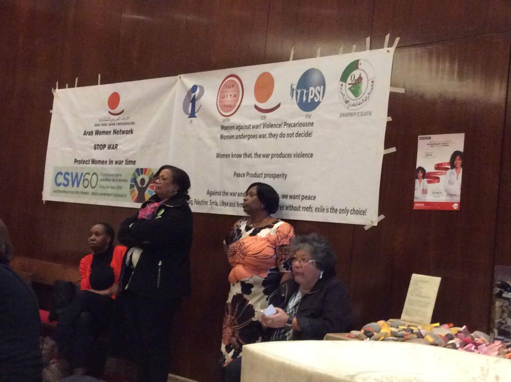 Du 14 au 24 mars 2016, la FTQ faisait partie de la délégation syndicale comptant plus de 160 femmes syndicalistes provenant de 34 pays différents qui participent à la 60e session de la Commission de la condition de la femme à l’ONU (CSW60), New York. Le thème principal de la Commission porte sur l’autonomisation des femmes et son lien avec le développement durable.