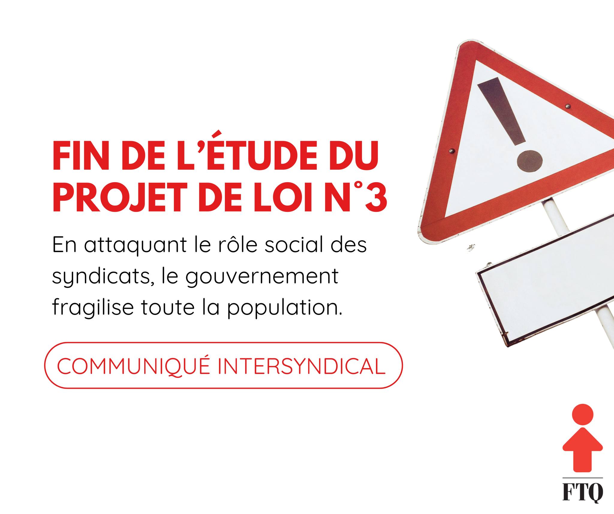 Rappelons que le projet de loi 3 du ministre Jean Boulet s’ajoute à la loi 14, qui freine le droit de grève des salarié-es. En plus de ces atteintes aux droits des travailleuses et des travailleurs, le gouvernement met de l’avant plusieurs projets de loi préoccupants, comme le projet de loi 1 et le projet de loi 9, au point où le Barreau du Québec et la Commission des droits de la personne et des droits de la jeunesse (CDPDJ) s’inquiètent publiquement d’une dérive autoritaire et d’un effritement de l’État de droit.