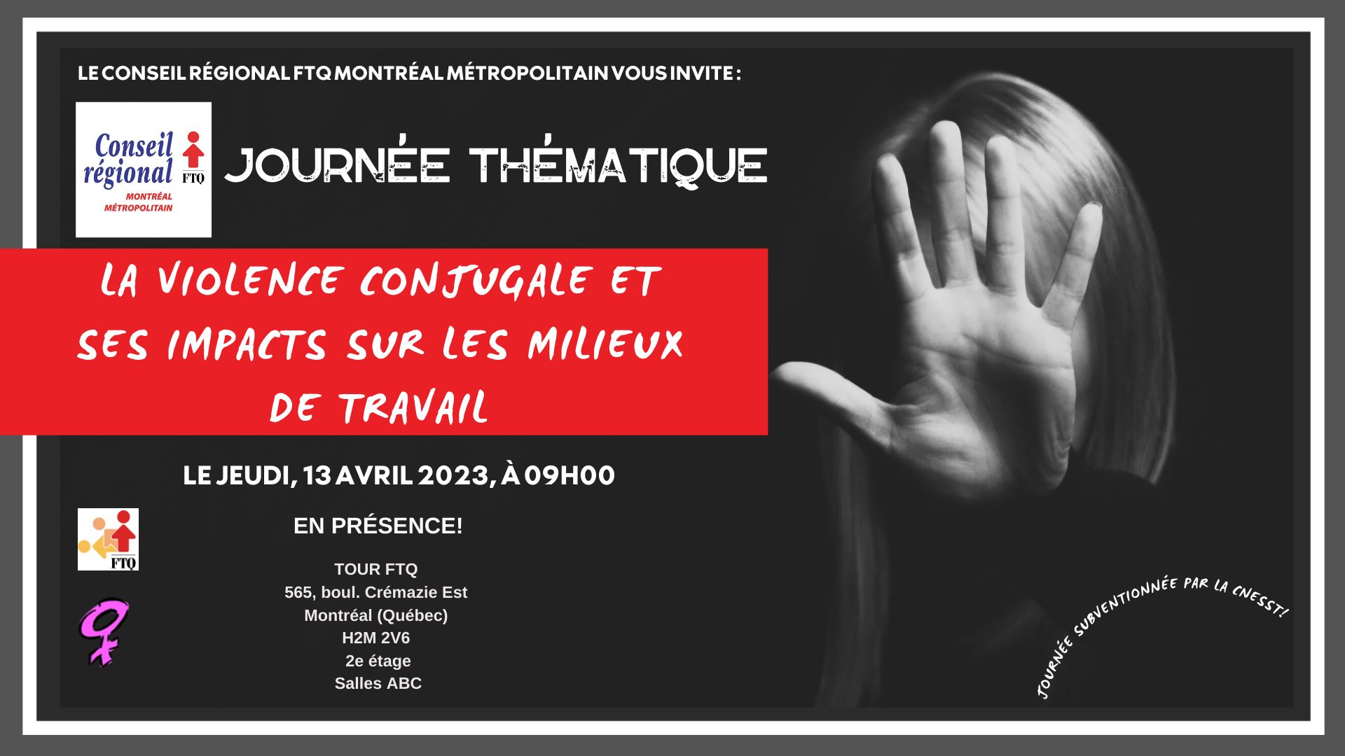 Le 13 avril prochain, le comité d’actions féministes et les coordonnateurs du réseau des délégué-es sociaux vous invitent à participer à une journée thématique sur la violence conjugale.
