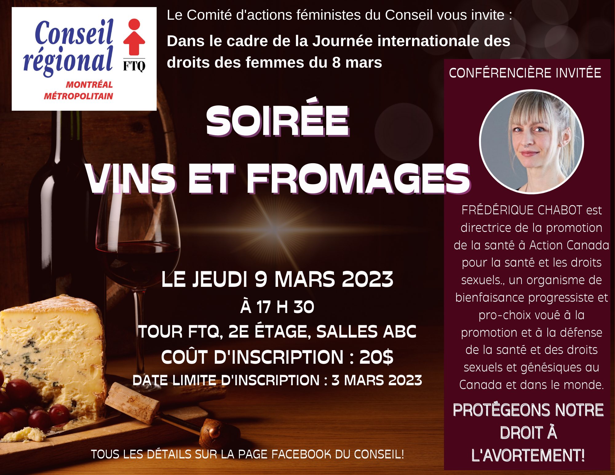Dans le cadre de la Journée internationale des droits des femmes, nous vous invitons à une soirée Vins et fromages, organisée par le Comité d’actions féministes du Conseil. Nous recevrons en cette soirée Frédérique Chabot, directrice de la promotion de la santé à Action Canada pour la santé et les droits sexuels. Un événement à ne pas manquer!