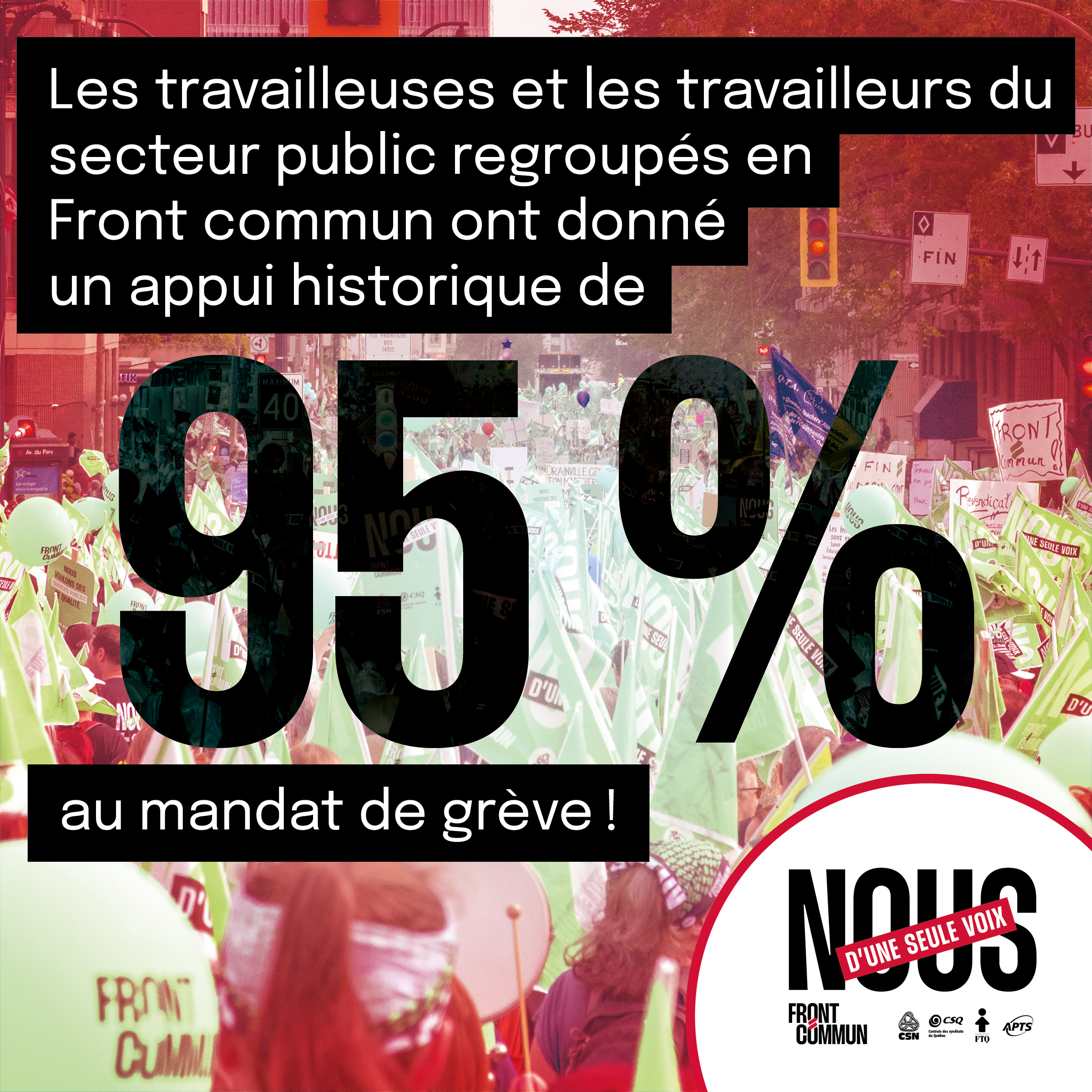 « Le mandat de grève que nous avons obtenu est historique! Il s’agit d’un message on ne peut plus clair au gouvernement. Nous en avons été témoins, il s’est vraiment passé quelque chose d’extraordinaire au cours des dernières semaines. La mobilisation des membres est bien concrète et très active. Le Front commun est ancré dans nos milieux. La hauteur du mandat avec lequel nous nous présentons devant le gouvernement doit être prise au sérieux. Si le gouvernement doutait encore du contexte dans lequel nous nous trouvons, ceci est le signal ultime », font valoir les représentants du Front commun, François Enault, premier vice-président de la CSN, Éric Gingras, président de la CSQ, Magali Picard, présidente de la FTQ, et Robert Comeau, président de l’APTS, rappelant tout de même que les alertes ne manquaient pourtant pas.
