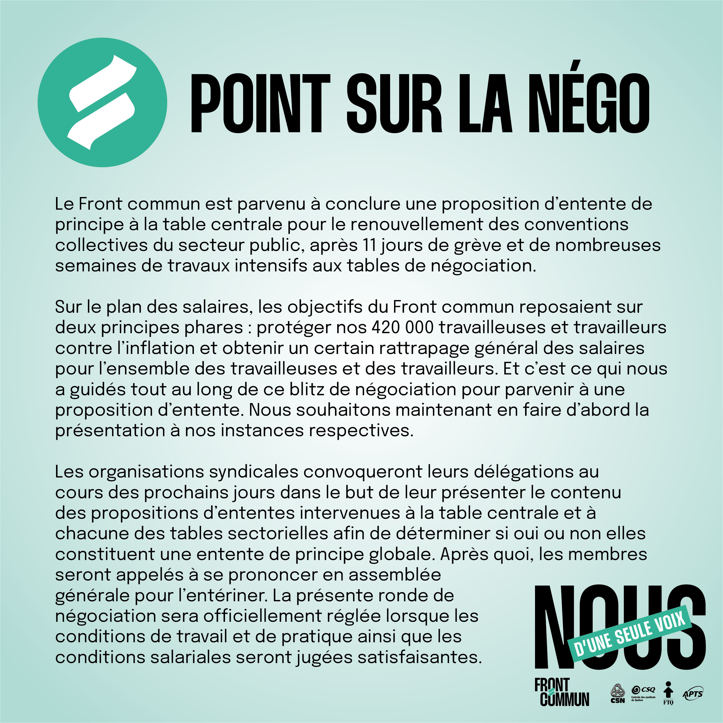 « Sur le plan des salaires, les objectifs du Front commun reposaient sur deux principes phares : protéger nos 420 000 travailleuses et travailleurs contre l’inflation et obtenir un certain rattrapage général des salaires pour l’ensemble des travailleuses et des travailleurs. Et c’est ce qui nous a guidés tout au long de ce blitz de négociation pour parvenir à une proposition d’entente. Nous souhaitons maintenant en faire d’abord la présentation à nos instances respectives », ont expliqué les porte-paroles du Front commun François Enault, premier vice-président de la CSN, Éric Gingras, président de la CSQ, Magali Picard, présidente de la FTQ et Robert Comeau, président de l’APTS.