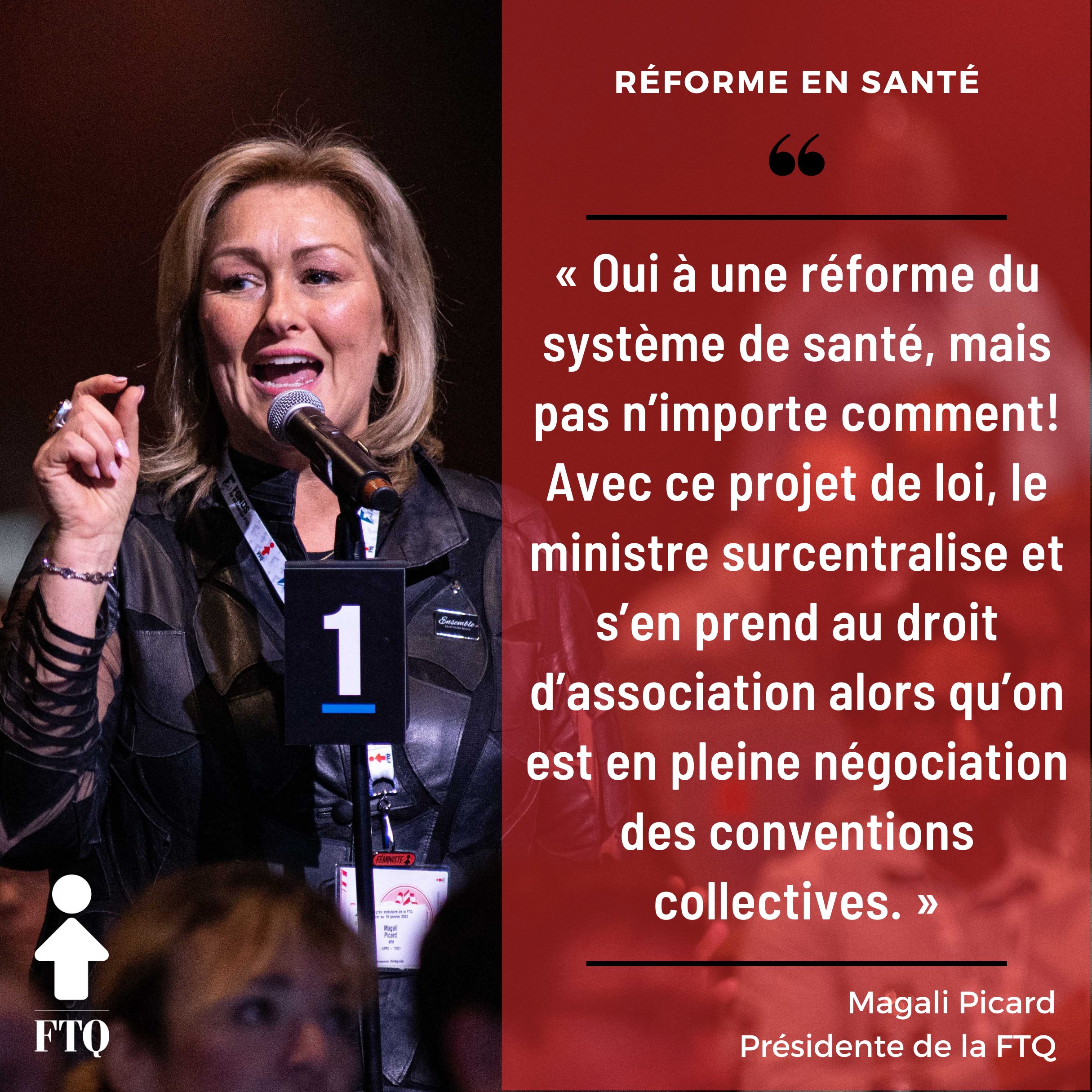 «On est tous d’accord que le système ne va pas bien. Et c’est clair qu’il faut des mesures concrètes, structurantes et audacieuses pour y arriver. Mais quand Gaétan Barrette, responsable de la crise actuelle du réseau, applaudit le projet de loi, il y a de quoi s’inquiéter! On a compris que la surcentralisation ne fonctionnait pas avec les libéraux, alors comment se fait-il que l’on aille encore dans cette direction? Depuis les années 1980, on joue à redéfinir les structures en santé et ça ne donne jamais rien de bon! On est passé par des CSSS qui ont ensuite mené vers des CISSS et des CIUSSS, et là on pourrait se ramasser avec une autre structure qui va nous plonger dans une période d’instabilité au lieu de s’attaquer aux vrais problèmes du réseau. Pourquoi ne pas faire une démarche avec tous les acteurs concernés?», déclare la présidente de la FTQ, Magali Picard.