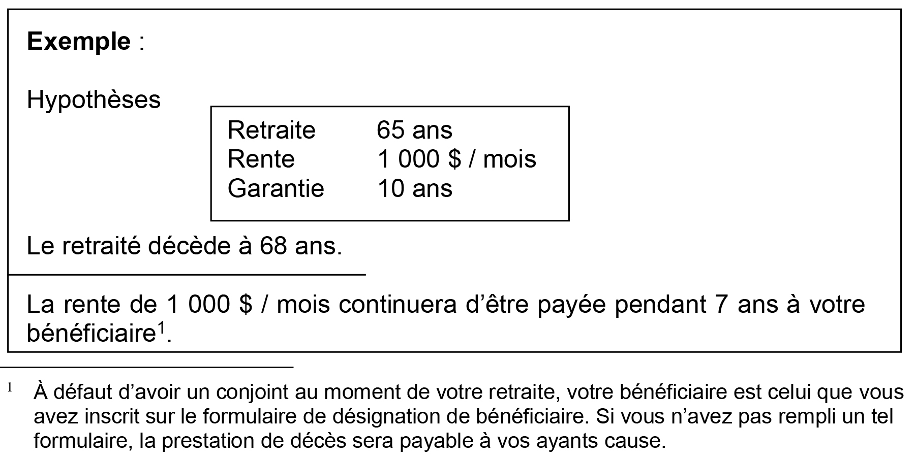 Même dans l’éventualité où vous avez un conjoint et que la forme automatique prévue à la question précédente est applicable, vous pouvez ajouter une garantie de 10 ans de versements à 100 % au lieu de 60 %.