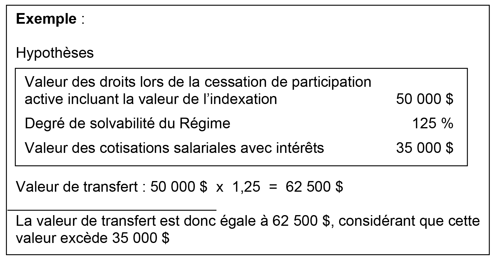La valeur de vos droits correspond à la valeur actuarielle de la rente normale créditée, incluant la valeur d’une indexation de cette rente à raison de 50 % de l’IPC, maximum 2 % par année, jusqu’à 55 ans, multipliée par le degré de solvabilité du Régime3. De plus, cette valeur ne peut être inférieure au total de vos cotisations versées au Régime avec intérêts.