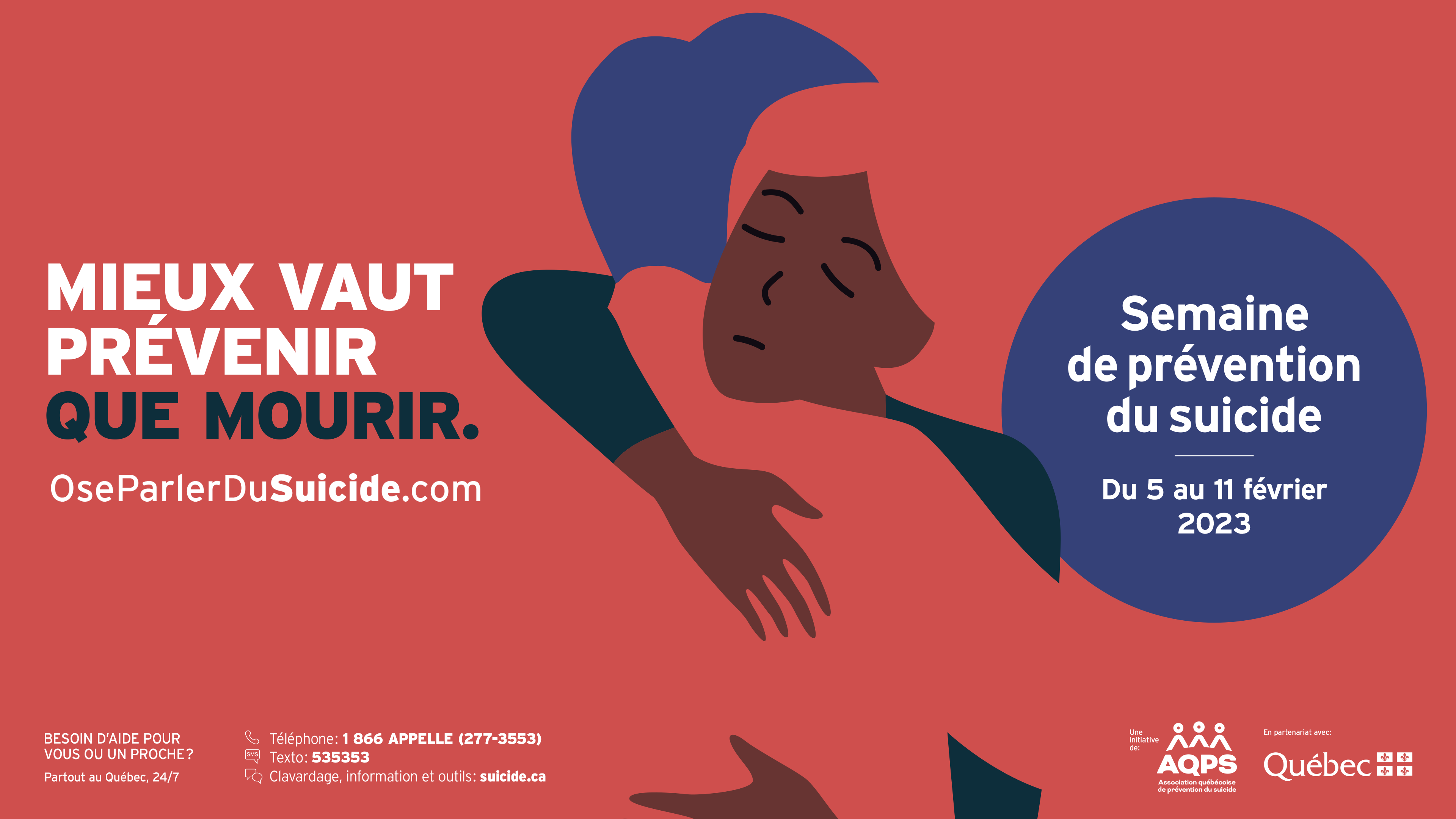 Cette 33e Semaine nationale de prévention du suicide reprend le thème Mieux vaut prévenir que mourir, met de l’avant l’importance de la prévention et encourage les gens à oser parler du suicide malgré les craintes ou l’inconfort, puisqu’agir peut faire toute la différence.