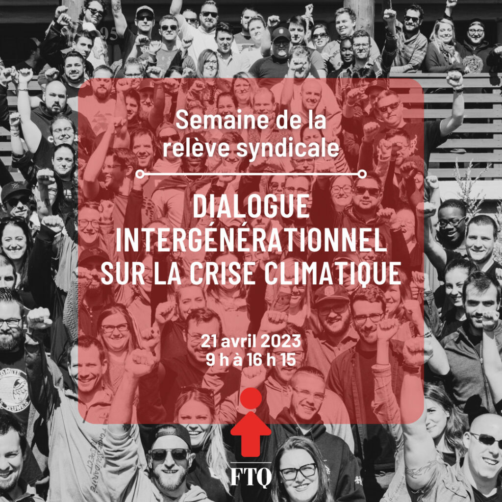 Dans le cadre de la Semaine de la relève syndicale 2023, les membres du comité Jeunes et du comité Environnement de la FTQ vous invitent à participer à un Dialogue intergénérationnel sur la crise climatique. Cette journée vise à favoriser une discussion intergénérationnelle entre les membres de la FTQ autour de la question climatique, de ses répercussions et des revendications à porter dans ce contexte incertain.
