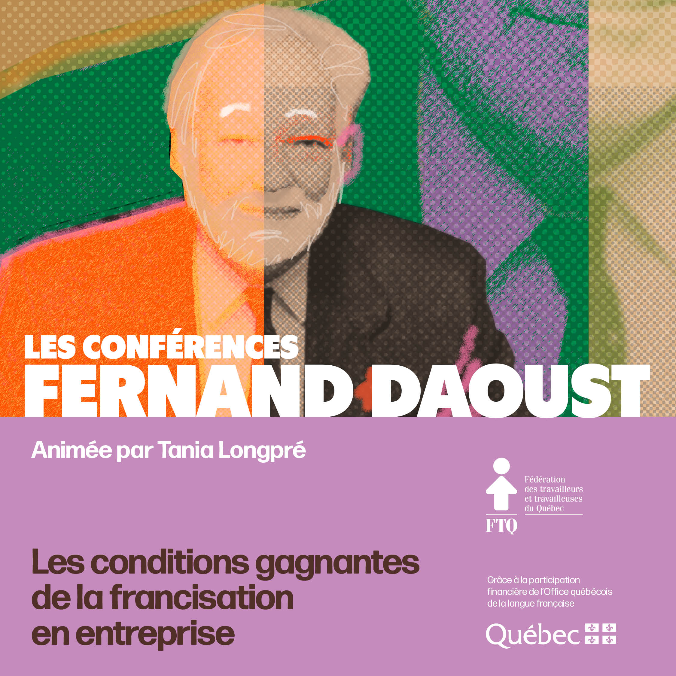 Le cycle annuel de Conférences Fernand-Daoust tient son nom de celui de l’ancien Secrétaire général puis président de la FTQ. Fernand Daoust est à l’origine de la francisation des milieux de travail au Québec; ces conférences lui rendent hommage en stimulant l’information et la réflexion syndicale sur le droit de travailler en français. Préparées et coordonnées par le service de la Francisation de la FTQ, réalisées grâce à la contribution financière de l’OQLF, les conférences Fernand Daoust sont conçues pour informer et faire réfléchir sur le droit de travailler en français.