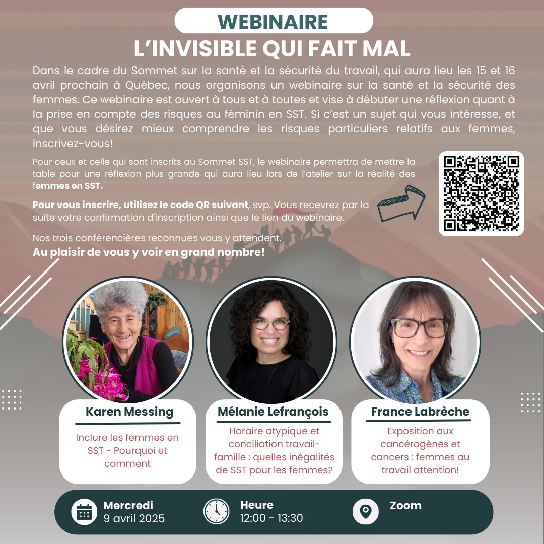 Dans le cadre du Sommet sur la santé et la sécurité du travail, qui se tiendra les 15 et 16 avril 2025 à Québec, et afin de débuter la réflexion d’un atelier qui se tiendra dans le cadre des états généraux du syndicalisme, nous vous invitons à un webinaire essentiel sur la SST et les femmes. Cet événement, intitulé « L’invisible qui fait mal », vise à mettre en lumière les enjeux spécifiques que vivent les femmes au travail, souvent négligés ou invisibilisés.